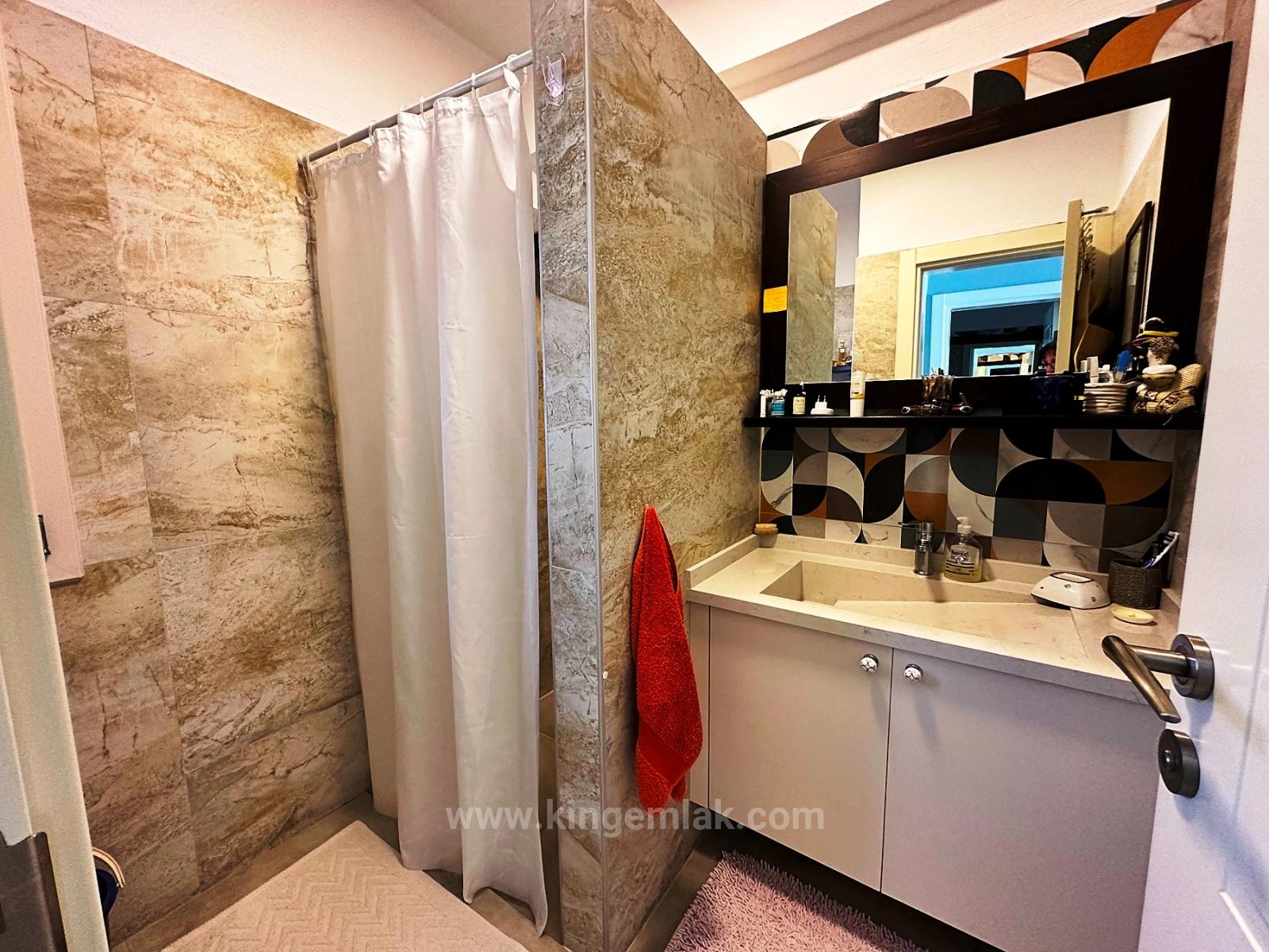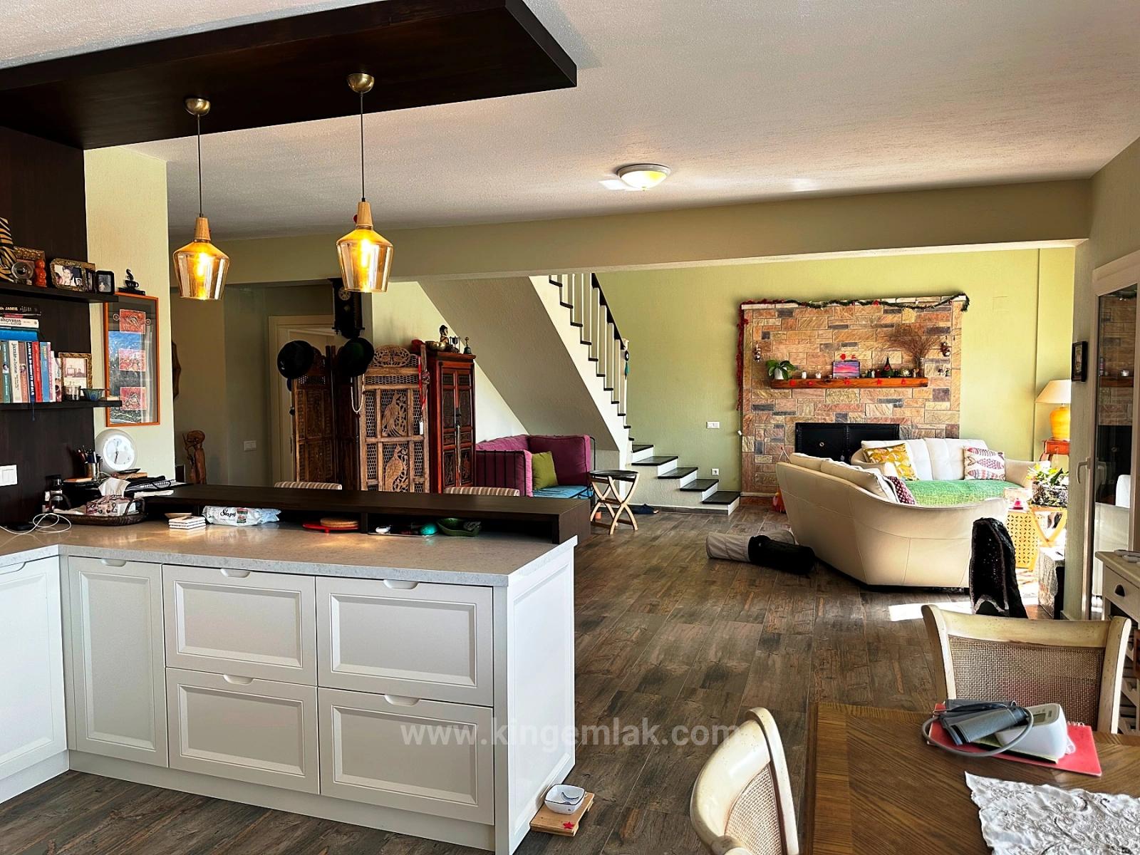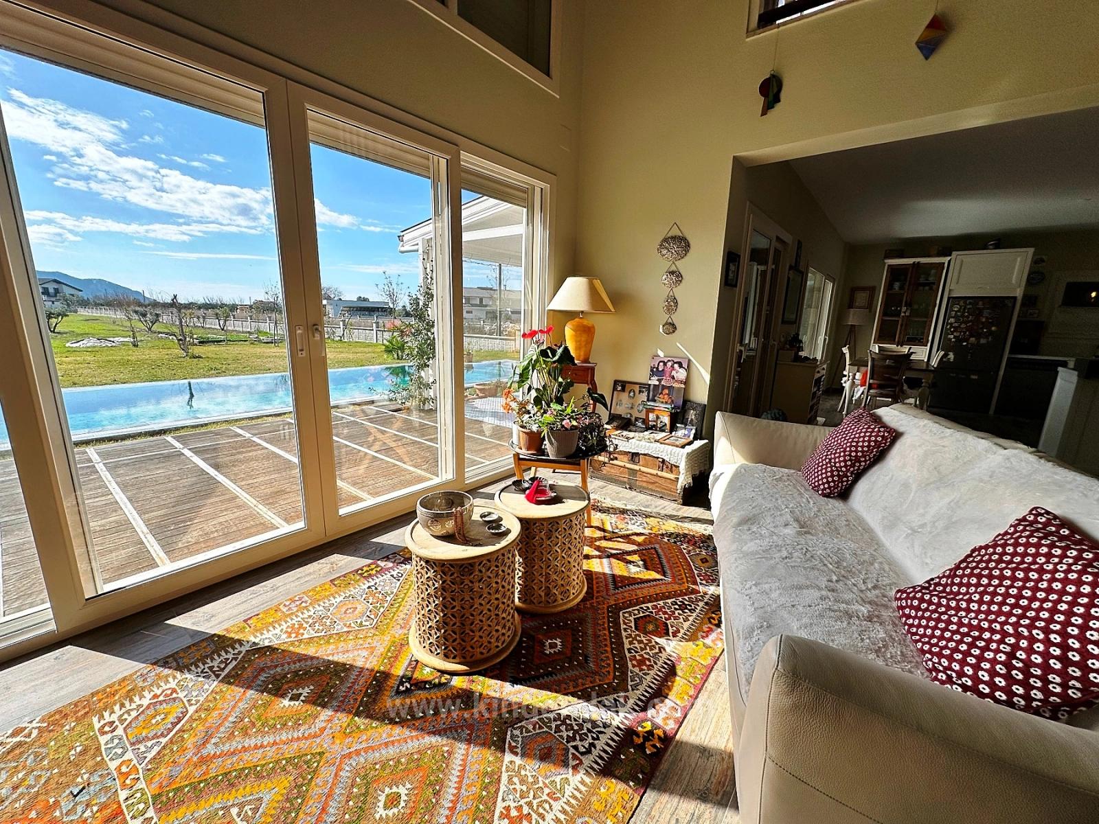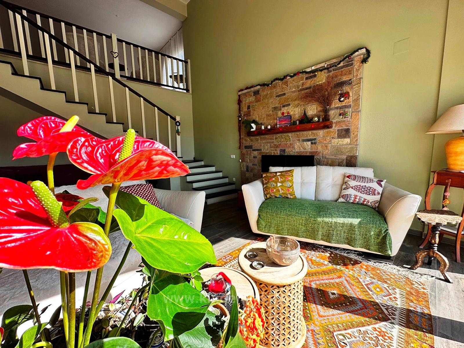 Located on a plot of land approximately 5,000 m² in size, the property's garden has been meticulously cultivated over the years, lovingly grown, and transformed into a living landscape. Stepping through the entrance gates, you are greeted by a covered parking area for four vehicles and a natural stone walkway leading you to the house. Every corner of the garden is filled with surprising details reflecting the creativity of its owners, who value art and originality; with every turn, you discover a different corner, a different atmosphere. Within the garden are a shower area, a vegetable garden, and an impressive 60 m² swimming pool. The spacious terrace at the rear of the house, half covered and half open to the sun, offers the perfect setting to relax throughout the day, enjoy the view, and soak up the Mediterranean sun. Upon entering the villa through the striking blue steel front door, you are enveloped in a refined and comfortable sense of elegance, shaped by the homeowners' carefully selected furniture and decorative pieces from around the world. The open-plan interior flows seamlessly from the entrance hall to the magnificent U-shaped kitchen, dining area, and breakfast bar; from there, you pass into the living room with an open fireplace. The enormous glass doors of the living room make the view outside almost a part of the house, offering a front-row view of the mountains. The ground floor also includes a guest bathroom, a double guest bedroom with a private en-suite bathroom, and a fully equipped pantry for food storage, an additional refrigerator, and a workspace. Climbing the wooden stairs leads to the first floor, which is in the form of an open gallery. The second living and television area here overlooks the mountains through a large panoramic window, creating an extremely peaceful atmosphere. The second bedroom, currently arranged as a healing and relaxation room, is a spacious double room with an en-suite bathroom. The master bedroom is truly impressive; it elevates luxury and comfort to the highest level with its generously sized living area and two separate en-suite bathrooms designed in a “men & women” concept.
