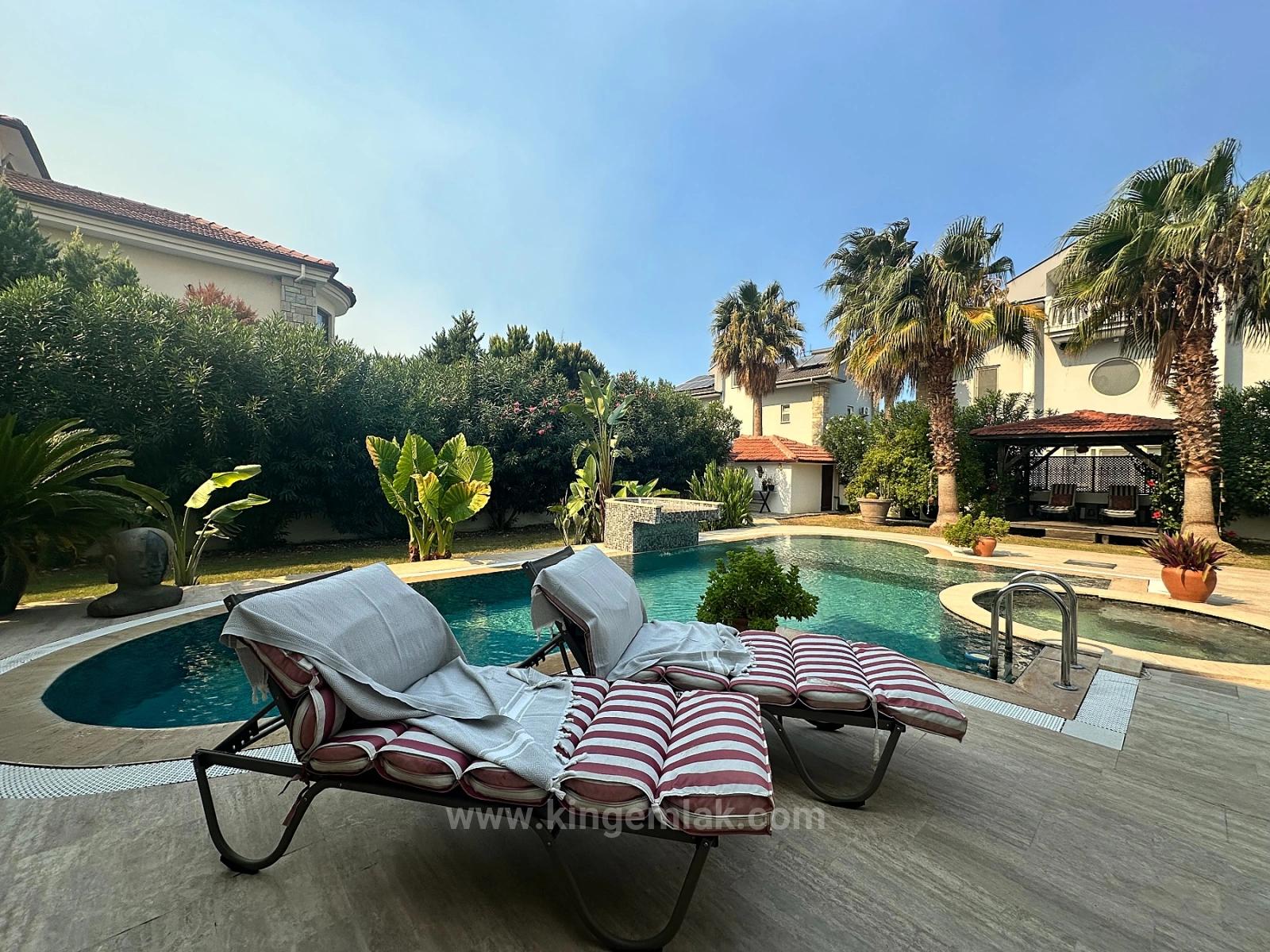 Kapılarından içeri adım attığınız anda villa, kendi başına ayrı bir dünya olarak karşınıza çıkar. Yüksek duvarlarla çevrili bahçe, adeta koruyucu bir koza gibi yükselir; rengârenk çiçeklerle, özenle şekillendirilmiş çalılıklarla ve olgunlaşmaya hazırlanan meyveleriyle ağırlaşmış ağaçlarla dolu bir cenneti içine alır. Yeni döşenmiş doğal taş yollar, mis kokulu çiçek sınırlarının arasından geçerek sizi villanın merkezine götürür: ısıtmalı, tuzlu suyla çalışan ve jakuzili muhteşem bir havuz. Burada yüzme adeta bir sanat hâline gelmiştir — suya doğru nazikçe dökülen şelale özelliği, havayı akarsu sesinin huzur verici melodisiyle doldurur; sığ güneşlenme alanı ise altın güneş altında yarı suya gömülü şekilde serinleyerek dinlenme imkânı tanır.