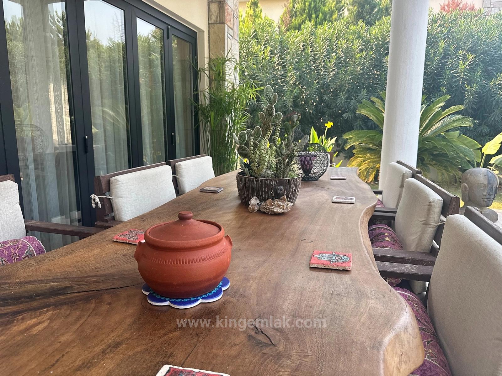 Burada dış mekân yaşamı adeta kusursuzlaştırılmıştır. Zemin katta geniş, gölgeli bir teras bahçeye doğru açılır; ortasında duran masif ahşap yemek masası, uzun yaz akşamlarında kalabalık sofralar ve kutlamalar için davetkâr bir merkezdir. Biraz ilerde, yeşilliklerin arasında geleneksel bir Türk köşkü yer alır; minderli oturma alanlarıyla okuma, hayal kurma ya da sıcak günlerde dinlenme için serin ve huzurlu bir köşe sunar.