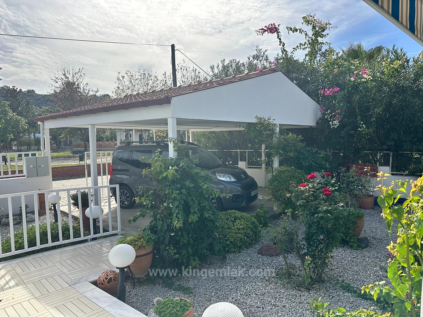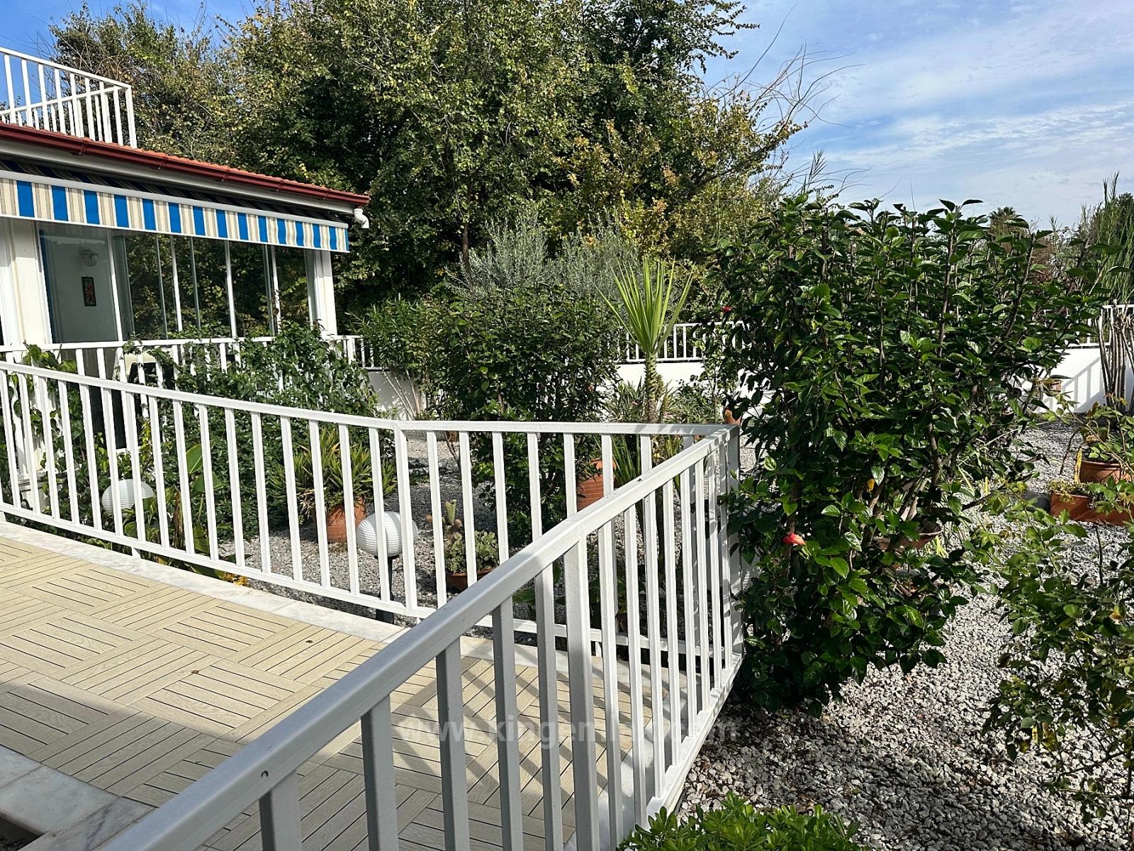 Villanın ön cephesinde, yapının tamamı boyunca uzanan uzun bir kapalı teras yer alır. Bu teras artık dumanlı cam panellerle tamamen kapatılmış olup yaz aylarında gölge ve serinlik sağlarken, ısıtma-soğutma sistemi sayesinde dört mevsim kullanılabilir hâle getirilmiştir. Elektrikli tente, sıcak günlerde ekstra konfor sunarak bu terası keyifli ve çok yönlü bir yaşam alanına dönüştürür. Bahçedeki yardımcı oda ise çamaşır ve depolama ihtiyaçları için büyük kolaylık sağlar.