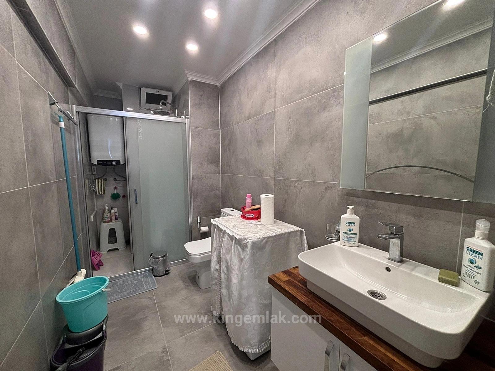 Sağdaki ilk kapı ana banyoya açılır. Duş, tuvalet ve lavabo ünitesinden oluşan banyoda zeminde ve duvarlarda yeni seramik karolar kullanılmıştır ve tavan aydınlatması gömme şekilde yapılmıştır. Banyoda ayrıca yeni, ekonomik Arçelik marka bir kazan ve çamaşır makinesi bulunmaktadır.