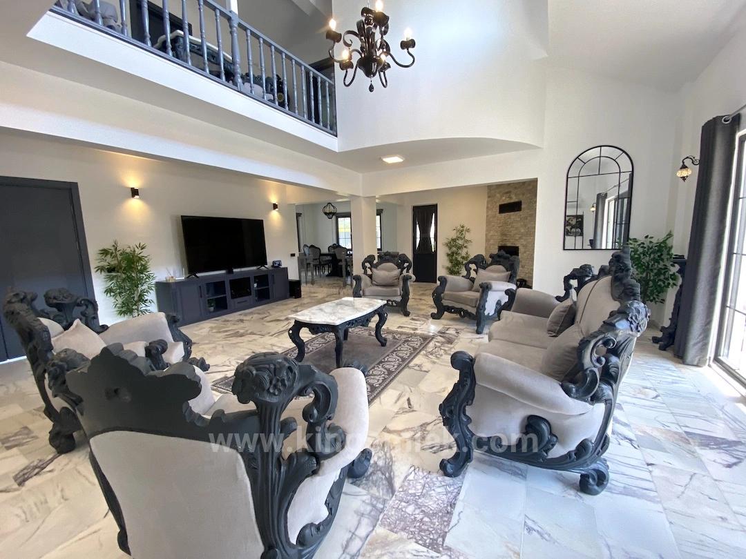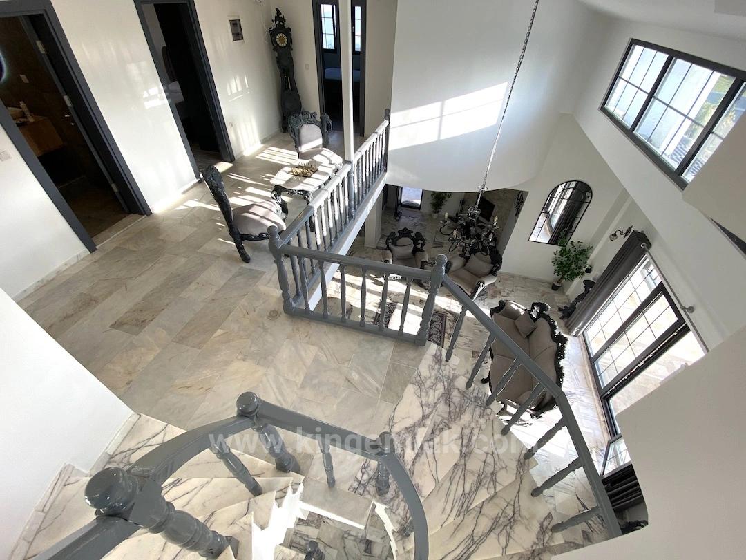 Ana villanın iç mekânları en az dış alanları kadar etkileyicidir. Zemin katta yer alan geniş ve ferah salon, yüksek tavanları ve etkileyici hacmiyle göz doldurur. Salonun yanında konumlanan modern mutfak ve ona bitişik yemek odası, hem günlük yaşam hem de davetler için ideal bir akış sunar. Özgün ve gösterişli koltuk takımları, salonun ihtişamını tamamlayarak mekâna zamansız bir zarafet katar. Zemin katta ayrıca, bağımsız girişe sahip ebeveyn banyolu çift kişilik bir yatak odası, geniş bir antre ve misafirler için düşünülmüş bir WC bulunmaktadır.